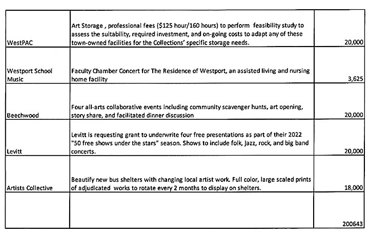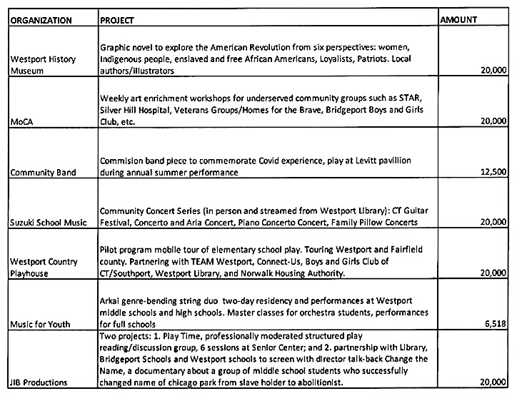 The remaining five arts groups seeking money from Westport’s ARPA grant.