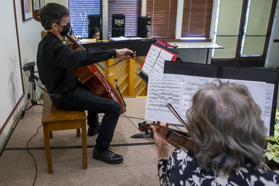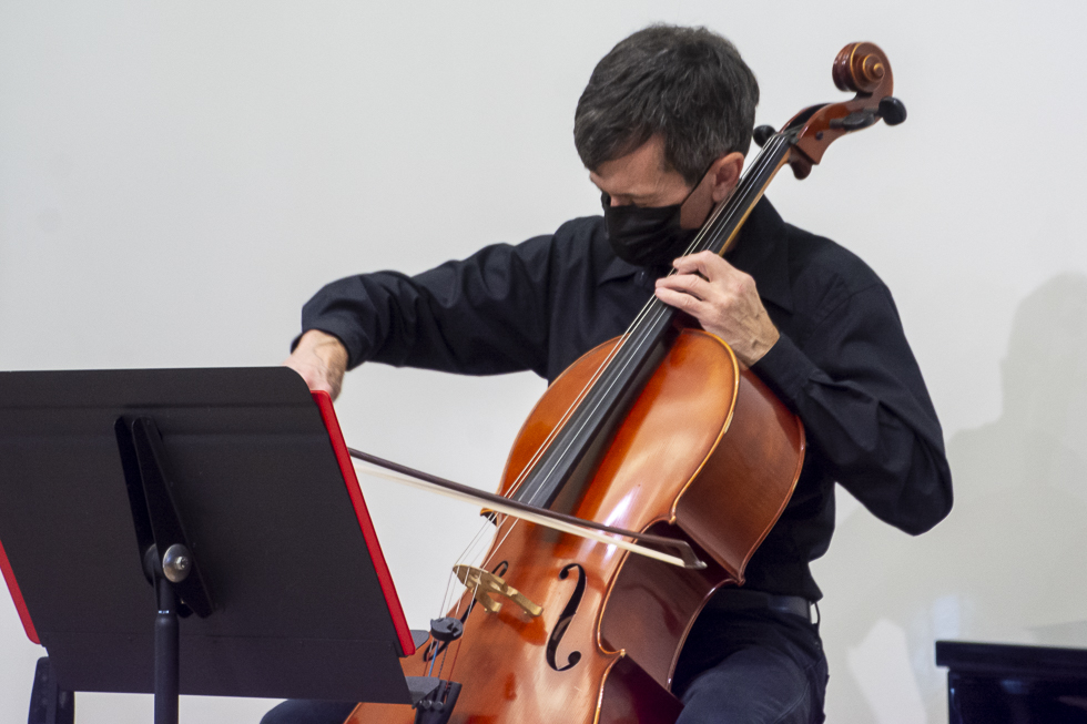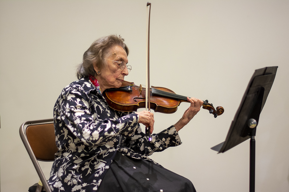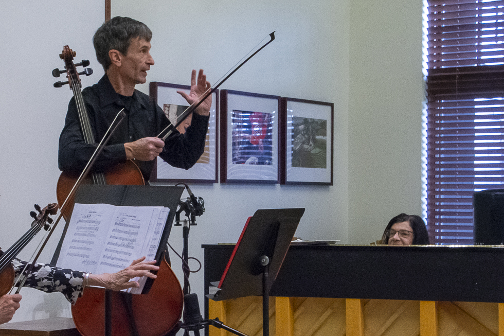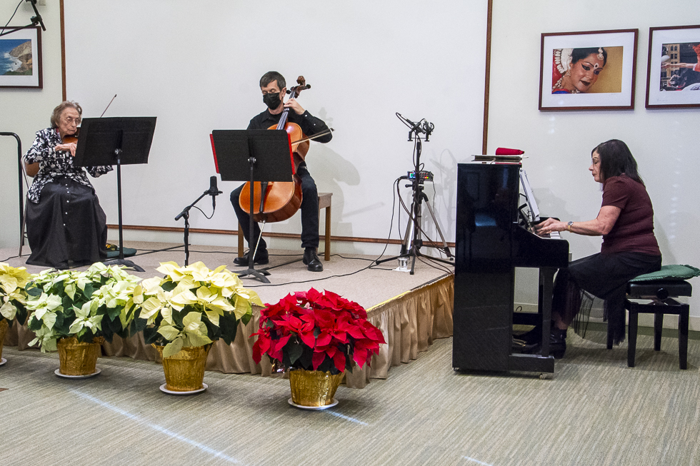 The program, called “A Kaleidoscope of Holiday Music,” featured violinist Bernice Stochek Friedson, cellist Andrew Woodruff, and pianist Nava Zeevi.