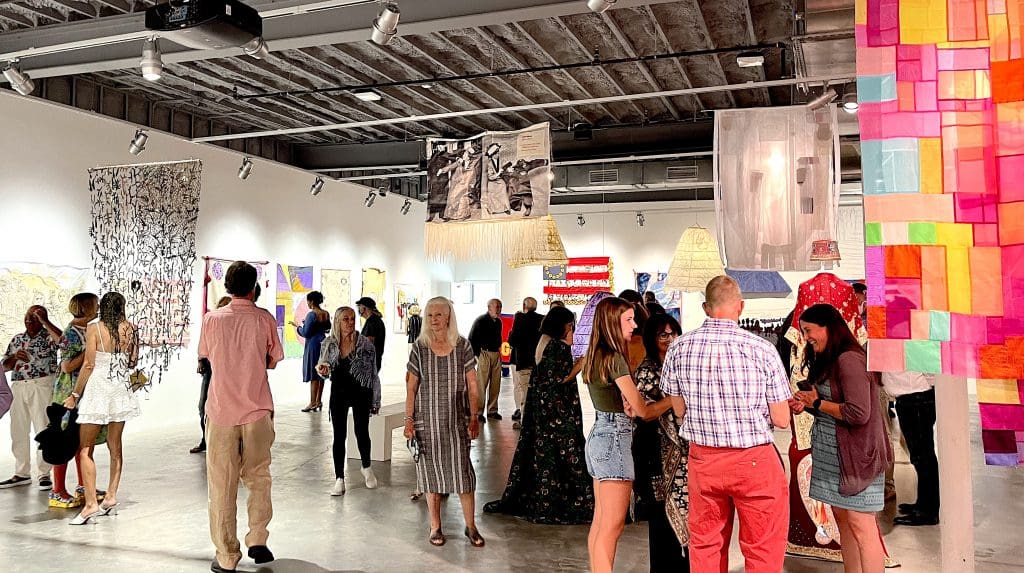 Crowd at the opening reception for the “Women Pulling at the Threads of Social Discourse” exhibition Thursday at MoCA Westport. / Contributed photos by Leslie LaSalaArtist Shelly McCoy writes on her interactive artwork, “We The People,” designed for people to write thoughts about the United States and its politics in red and blue crayons. It is part of the exhibit at MoCA Westport through Sept. 4.