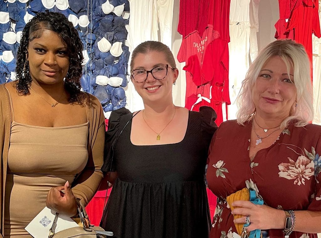 MoCA Westport teachers, from left, Erika McGhee, Isabelle Camillo and Agata Tria at the opening of the “Women Pulling at the Threads of Social Discourse” exhibition.