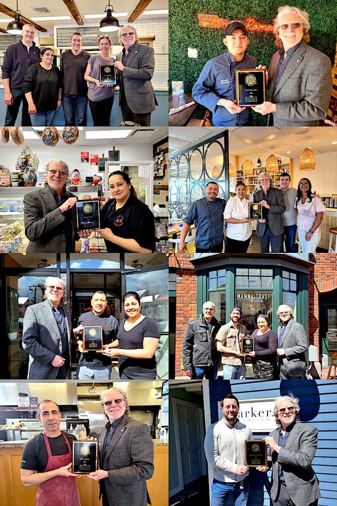 Winners in the “Great Westport Salad Contest” are presented plaques by Matthew Mandell, executive director of the Westport-Weston Chamber of Commerce. Winners, in eight different salad categories, are clockwise from top left: The Porch, salad greens; Romanacci, Caesar; A&S Fine Foods, deli; La Place, Cobb; Capuli, unique; Manna Toast, Mediterranean; Joe’s Pizza, chef’s, and Parker Mansion, make your own. / Contributed photo
