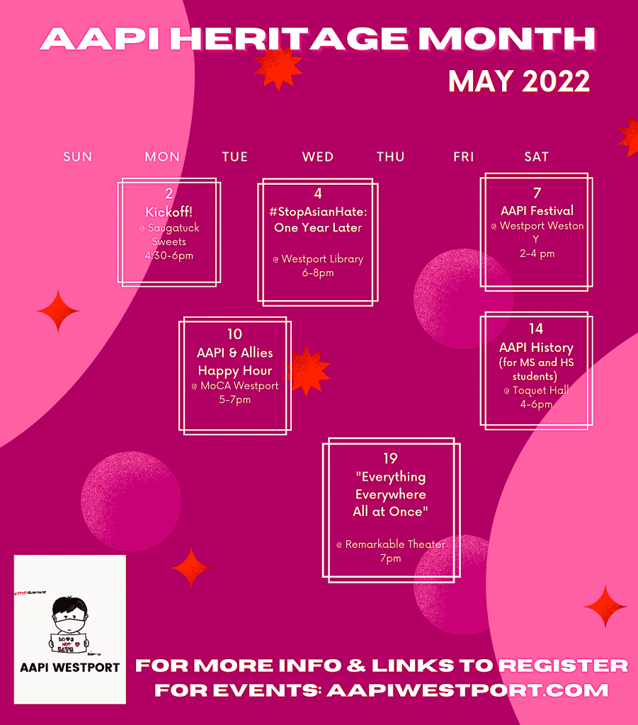 Monday, May 2, 4:30-6 p.m.: Kickoff of AAPI Heritage Month at Saugatuck Sweets, 575 Riverside Ave. First Selectwoman Jennifer Tooker will issue a proclamation recognizing the month-long observance.