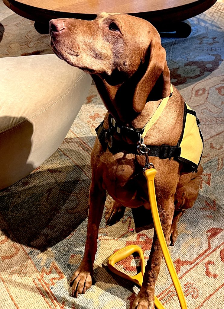 Penny is a Vizsla, a breed originally from Hungary with a temperament that is soothing and supportive, according to John Koizim, her owner.