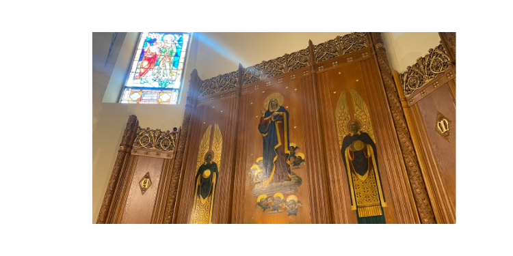 But the new interior paint job is only part of the restoration. The two steeples, one larger than the other, have been restored. A painting of the Virgin Mary ascending to heaven on the reredos – the wooden screen behind the altar – will also be restored and brightened by removing a layer of varnish that was applied sometime after the mural was completed.