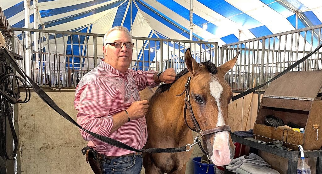 Ken Markosky unbraids the mane of Athena, one of the 37 horses belonging to Silvermine Farm in Norwalk, the stable owned by Markowsky and his wife Sarah Natale. They brought six horses to this year’s show at the Fairfield County Hunt Club, and two of their horses and riders won championships at the show. / Photos by Gary Webster