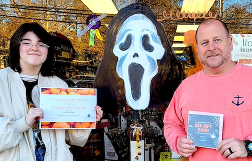 Penelope Whitbourne, a seventh grader at Bedford Middle School, poses with her “Scariest” prize-winning Halloween decoration, with owner Jim Boyrer at the Greens Farms Spirit Shop.