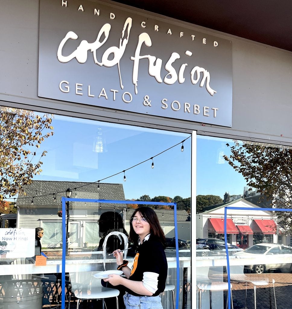 On Main Street, Penelope Whitbourne, 11, a Bedford Middle School student, was painting a ghost she called “cute and scary” at Cold Fusion Gelato, 178 Main St. It was Penelope’s first time participating in the contest.