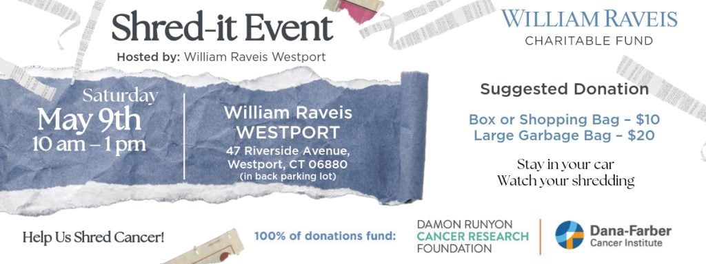 Fortunately, the annual William Raveis Real Estate 100% Charitable Shred It Event for Cancer Research will take place on May 9 at 47 Riverside Avenue, Westport, from 10 a.m. to 1 p.m.