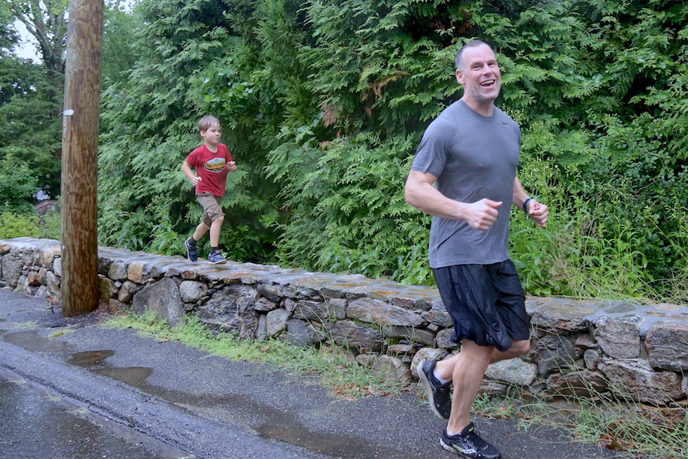 Robert Dranitzke of Westport and his son Thor, 7, didn’t let a little rain impede their jog along Whitney Avenue Sunday afternoon. (Photo by Jarret Liotta)