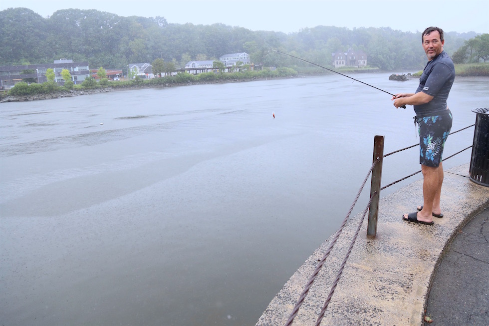 Later in the afternoon he was casting a fishing pole into the Saugatuck River at Parker Harding Plaza.