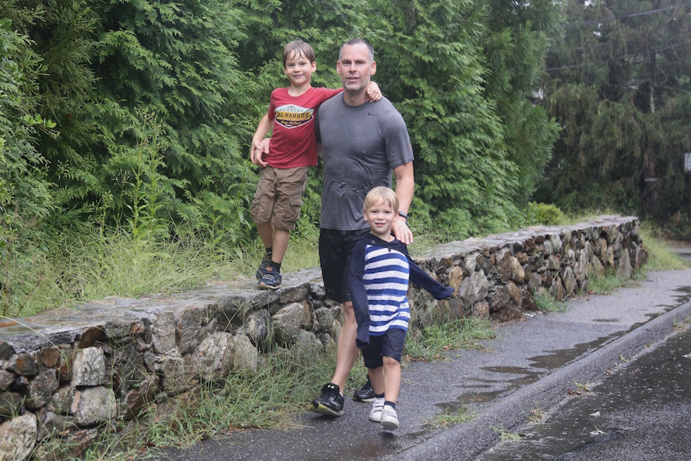 Robert Dranitzke of Westport was jogging in the drizzle along Whitney Street, with sons Thor, 7, and Leo, 5.