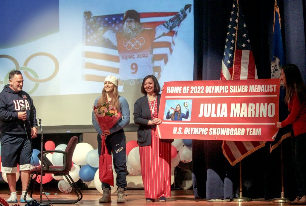 Marino was the first American to medal at the 2022 Winter Olympics in Beijing during February. She won in the Women’s Snowboard Slopestyle. A video of her medal-winning run was shown on a big screen during the assembly.