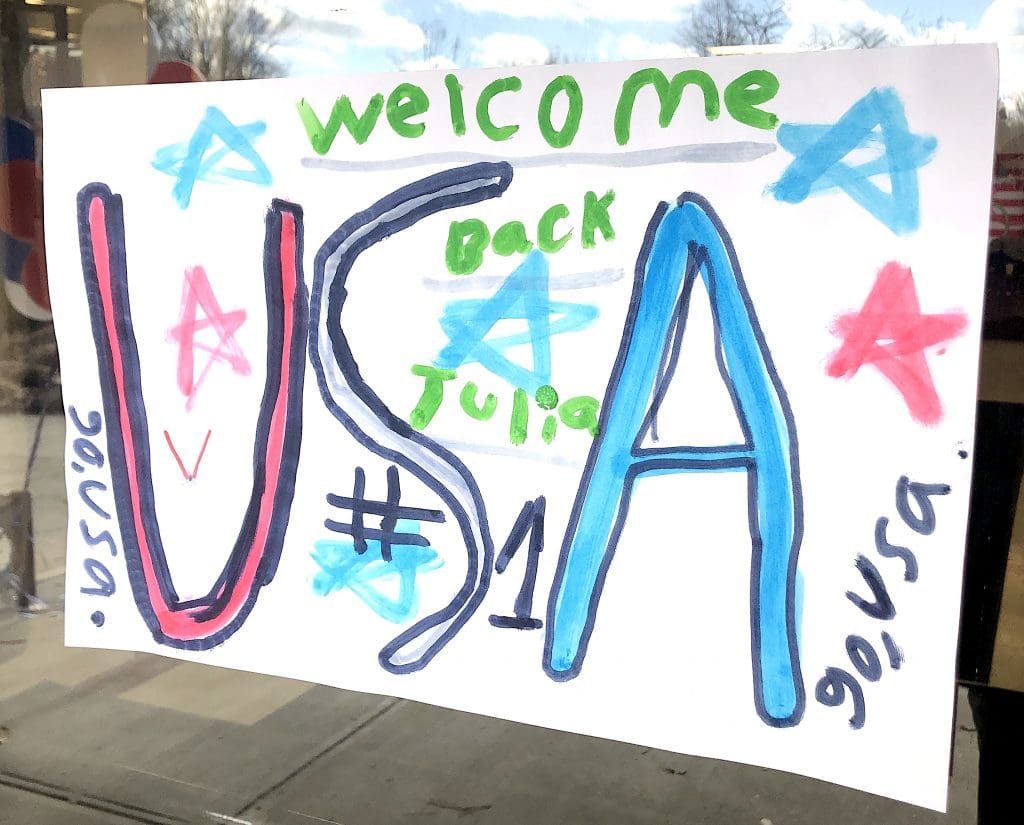 The Long Lots Elementary School entrance, walls and auditorium were decorated with homemade flags and posters in anticipation of the Westport snowboarder’s return after 15 years.