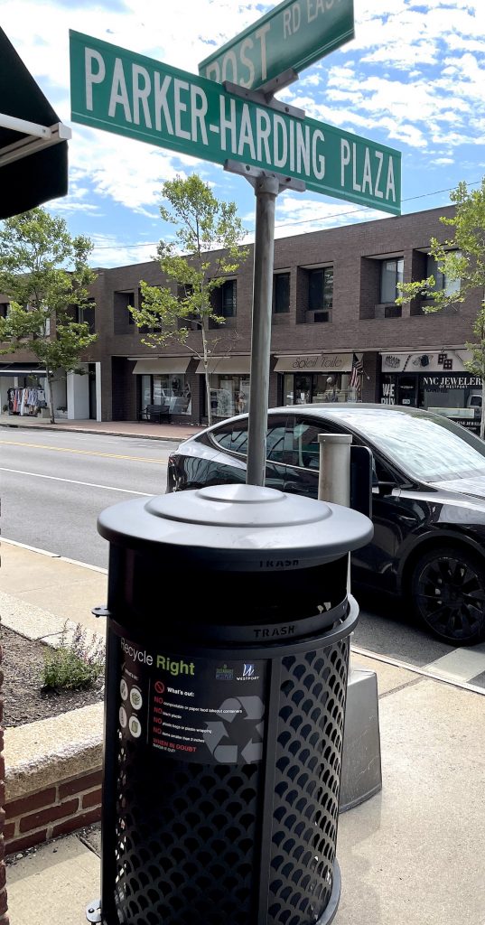 Right: Downtown Plan Implementation Committee expects to install more trash cans, such as this one at the corner of Post Road East and the Parker Harding lot.