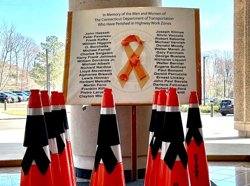 A simple memorial in the DOT lobby lists names of the 13 and 24 other workers killed in work zones. Where someone might ordinarily leave flowers, there are orange traffic cones marked CT DOT and wrapped in black ribbon.
