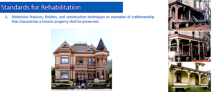 The group reviewed 10 National Rehabilitation Standards set by the federal secretary of the interior for the treatment of historic properties. These include Standard 5: “Distinctive features, finishes and construction techniques … that characterize a historic property shall be preserved,” and Standard 6 that encourages deteriorated historic features to “be repaired rather than replaced.”