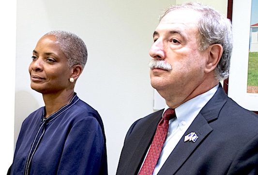 Stephanie Thomas, elected secretary of the state last November, and state Rep. Jonathan Steinberg, D-Westport, both supported efforts to allow early voting in Connecticut for the first time. They were photographed at the local veterans event last year. / File photo