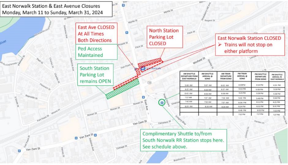 “The road closure is timed to be concurrent with the temporary East Norwalk Train Station closure, also occurring from March 11 to March 31,” Norwalk’s announcement stated. “During this three-week period, there will be no trains stopping at the East Norwalk Train Station. The parking lot on the south side of the station, however, will remain open.”