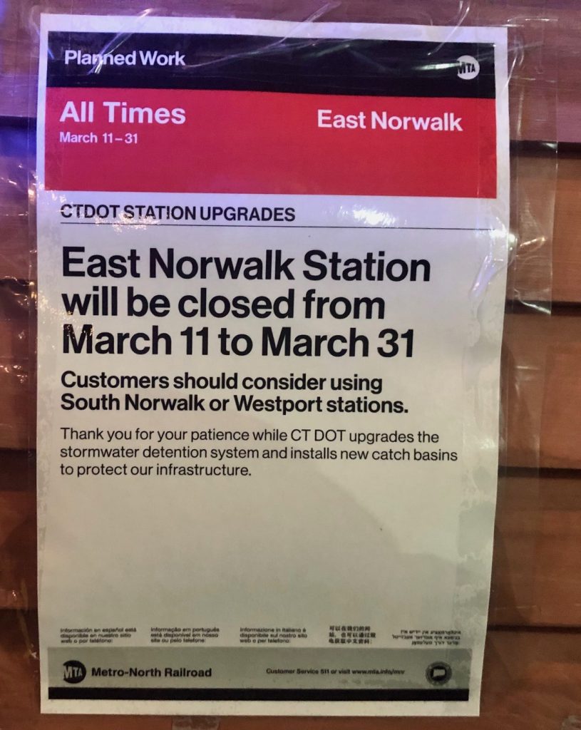 Commuters using the East Norwalk station, which include Westporters, were surprised last week to see signs announcing the station’s closure for three weeks. An announcement from the DOT followed a couple days later, detailing the reasons.