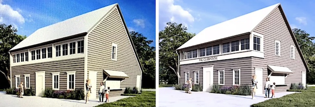 Revised design for the proposed Westport Police Athletic League clubhouse, at left, won support from the Architectural Review Board after it suggested changes to the original plan, at right