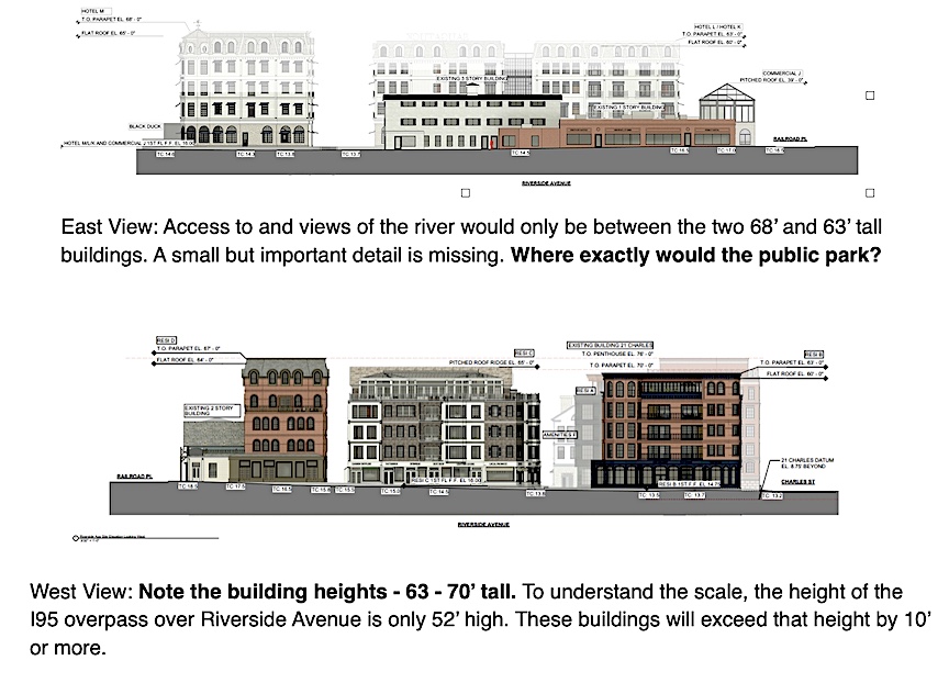 - Lack of open space, sky and access to the riverfront: At the most recent Architectural Review Board meeting, board members repeatedly asked for a scale model, but the developers refused. Board members said they could not “wrap their arms around” the ramifications of the development and questioned why the developers’ renderings did not offer views depicting the height of the buildings. After some back and forth, the board was able to get the developer to agree to provide street level elevations of Riverside Avenue.