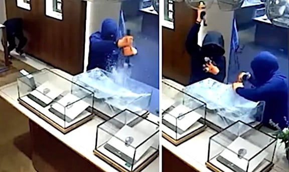Two masked thieves wielding sledgehammers shattered display cases at Lux, Bond & Green on Main Street, stealing merchandise valued at over $100,000, Woods said. The burglary took place about 3:10 p.m. Thursday, May 9.