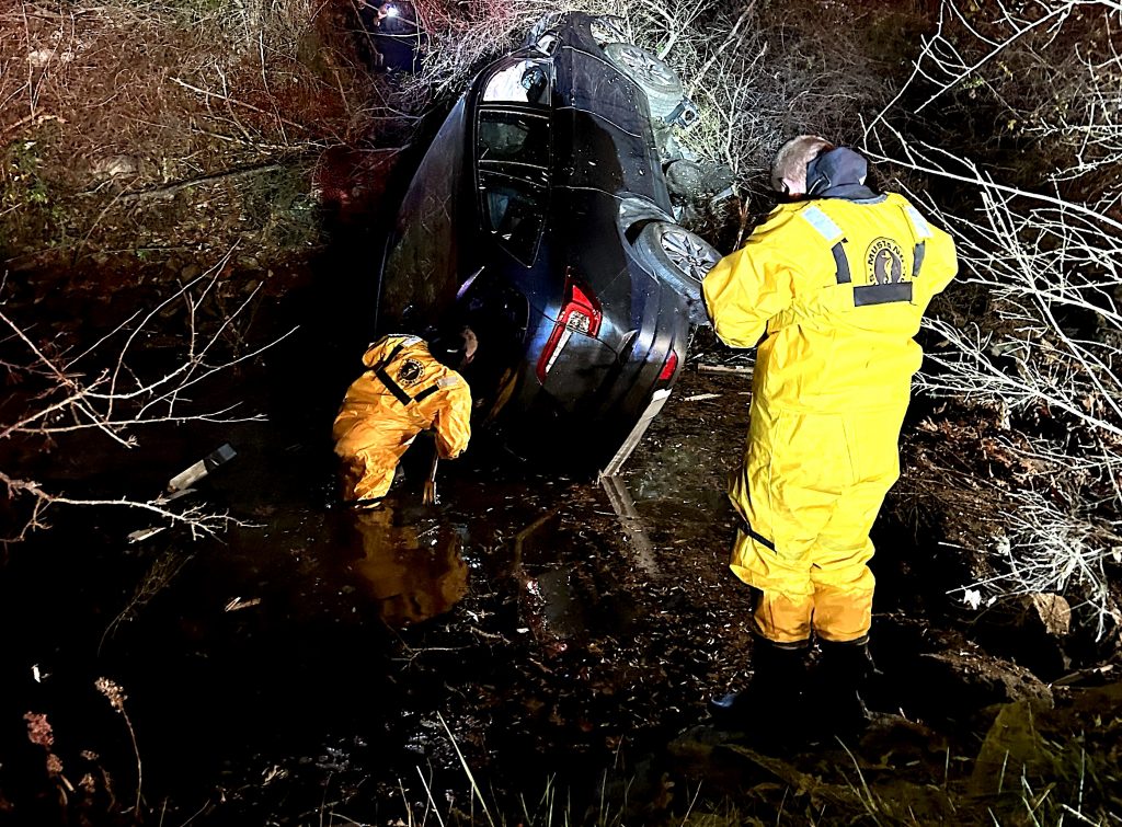 Arriving at the scene, firefighters found the vehicle on its side in about two feet of water, according to the report by Assistant Fire Chief Jeffrey Gootman. Wearing cold-water gear, firefighters were able to remove the lone occupant from the car.