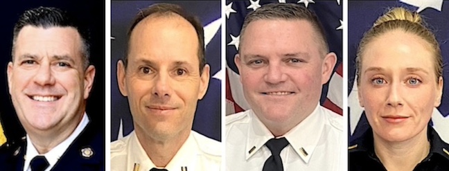 Top-ranked officers in the Westport Police Department slated to be sworn in May 23 are, from left, Chief David Farrell, Deputy Chief David Wolf, Capt. Eric Woods and Capt. Jillian Cabana.