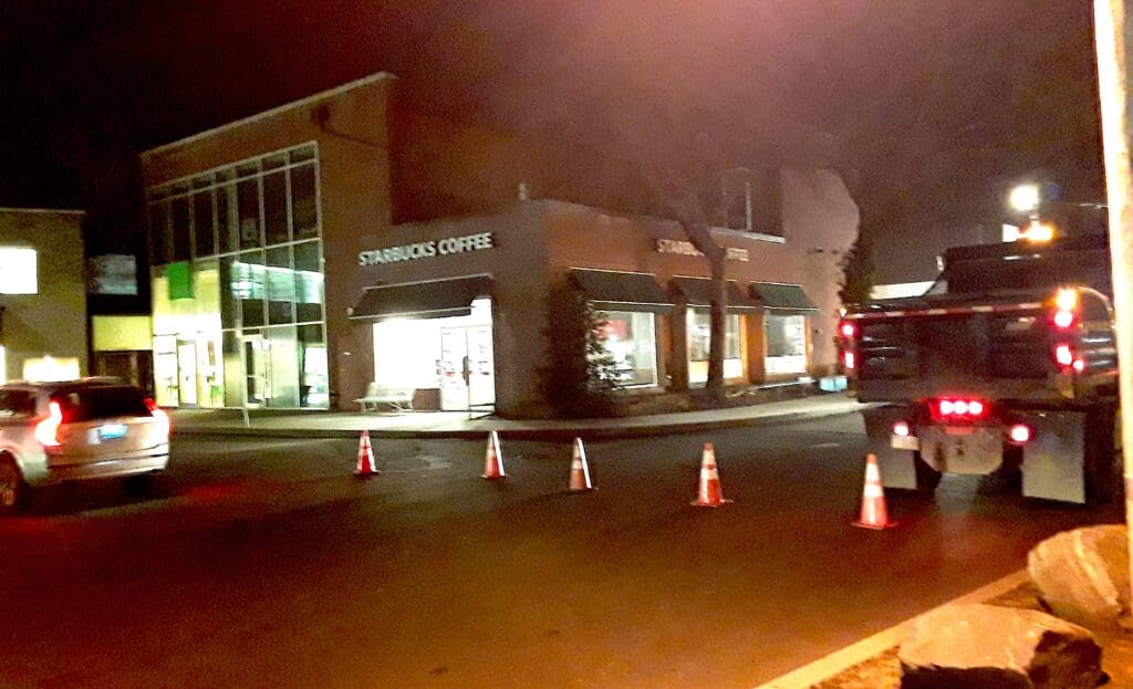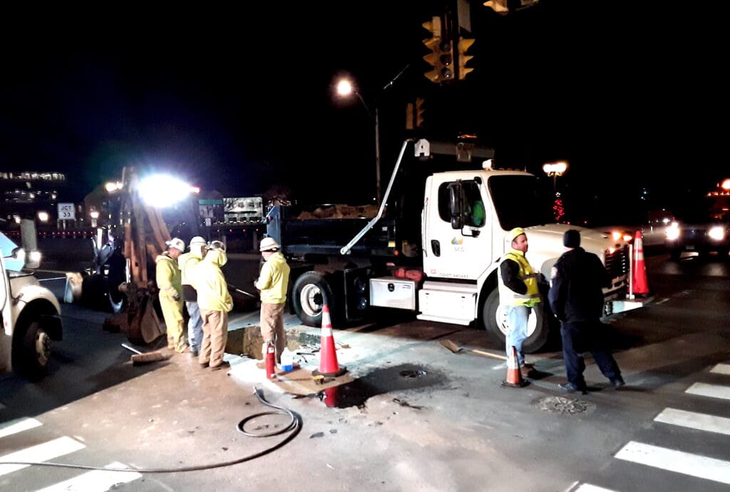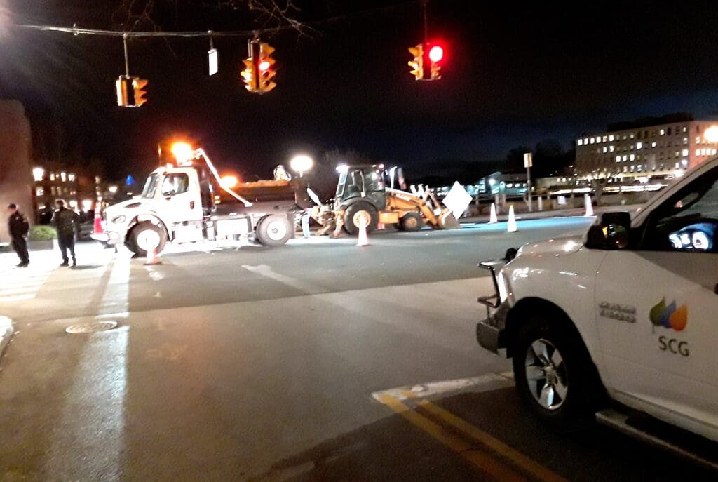 Repair work by crews from Southern Connecticut Gas continued throughout Tuesday afternoon and into the night, forcing diversion of traffic at one of the town’s busiest intersections.