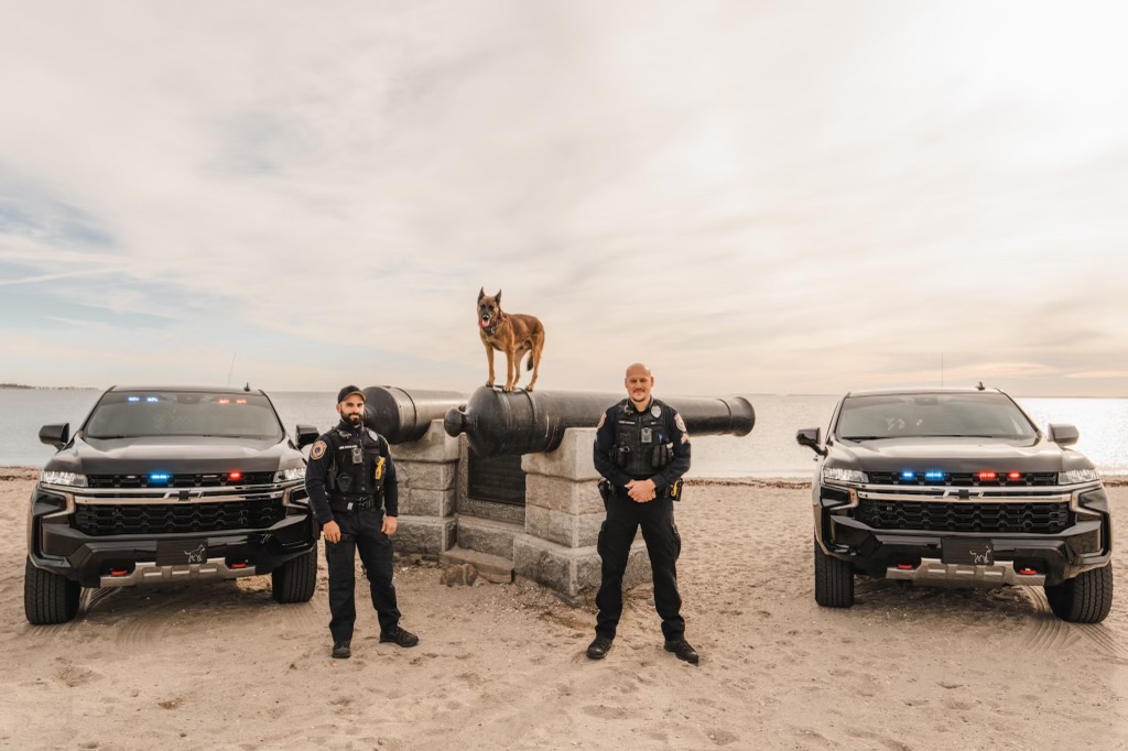The Westport Police Department’s K-9 unit consists of two handlers and three dogs. Corporal James Loomer handles Brutte, a Belgian Malinois certified in patrol techniques and narcotics detection, and Ambo, a Labrador retriever certified in explosives detection. Corporal David Scinto handles Grizz, a Belgian Malinois-German shepherd mix.