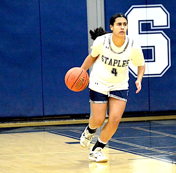Staples’ Freya Harvey, in a home game earlier this season, scored the game-deciding free throws in the Wreckers’ 44-42 win at Fairfield Ludlowe on Friday. / Photo by Andy Hutchison